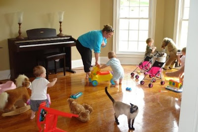 Yesterday Austin and I went to Brian & Anna's home in Anderson for a playdate with her charming toddlers, Brianna and Bennett, and newborn baby Brock. Tonya was there with wild man Tyler as well! Austin didn't know what to think of all the chaos at first and clung to me for awhile, but after I gave him his bottle (with Bennett's help) he seemed to start feeling more comfortable in his new surroundings. He liked to look at the other kids but kept his distance. Austin spent most of the afternoon chewing on a toy, sitting with me, or pulling up on the coffee table (what is with this boy and coffee tables??).