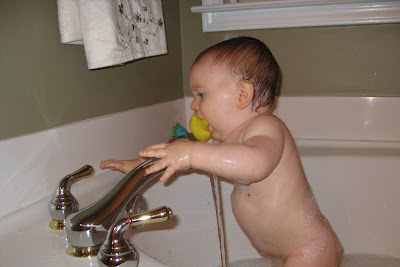 With regards to bathing, I've discovered another of Austin's "quirks" here in the past several weeks. He simply can not take a bath when the water is not running!! Whenever I turn the water off, he stands up and turns it back on and then sits back down and goes back to playing with his bath toys. He, however, doesn't quite yet understand the concept of mixing the hot and cold water together and thus only turns one handle...luckily most often he chooses the cold. I tell him "no" whenever he reaches to turn the water on but he usually just hesitates a little, smiles his little devilish grin and turns it on anyway. It's so hard to keep a stern face though when his mischievousness is just so darn cute!