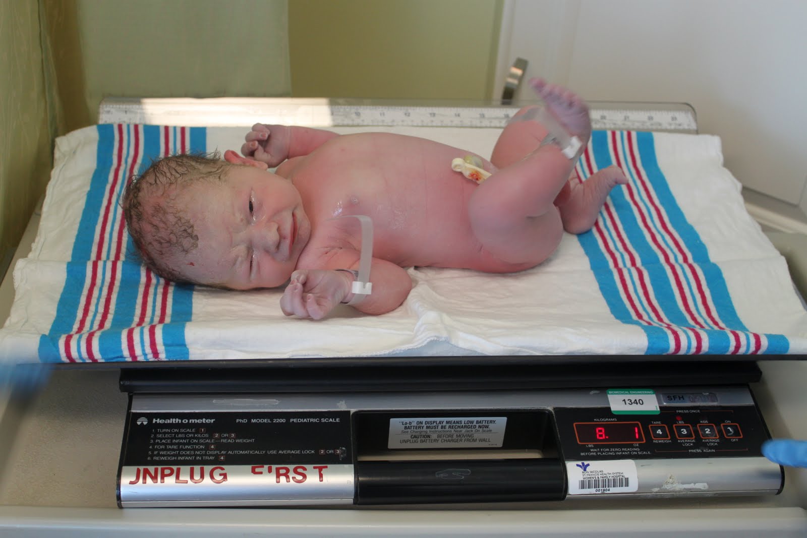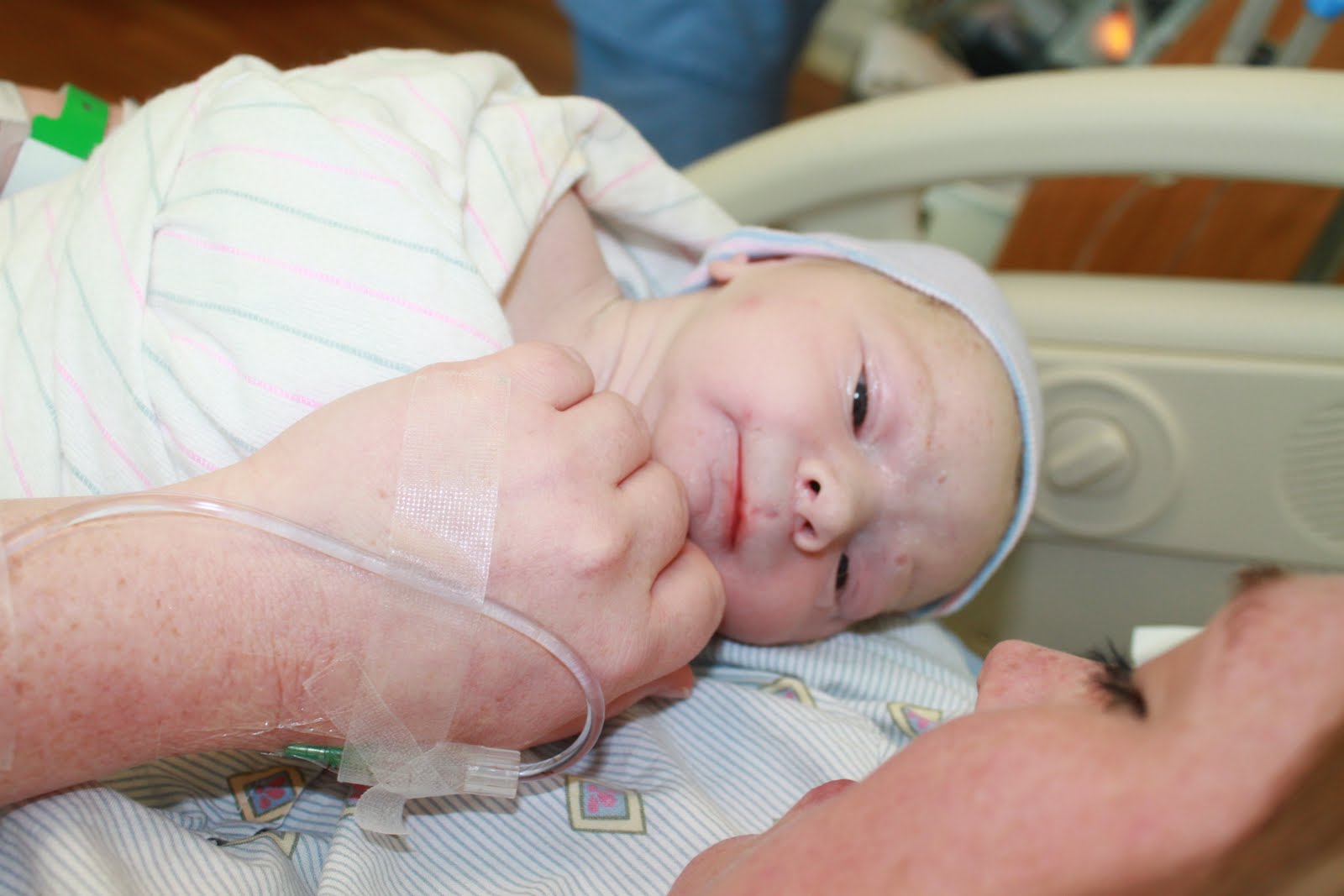 Ryan cut the cord and they wiped down my wiggly screaming baby and then placed him on my chest. I fell instantly in love and gave his wrinkled head a big kiss before they took him to the warmer. The sound of his cries were music to my ears and I waited impatiently as he was weighed, measured and cleaned. I finally got him back and he opened his eyes and looked directly at me. He was beautiful and perfect and so alert. I just laid there and stared at him in my arms for what seemed like forever.