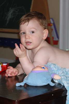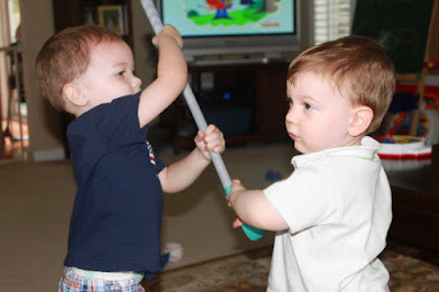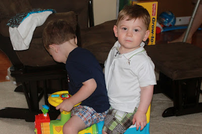 The boys had a great time playing together. They battled with Austin's golf clubs, chased each other around the house, stacked and knocked over towers of blocks and pushed each other around on Austin's toy train. We really enjoyed just sitting back and watching the boys play together and chatting and catching up with our good friends. We were sad that Freedom Weekend Aloft got rained out, but it ended up being a great day to spend indoors!