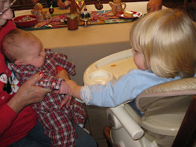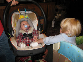 Today we went to Lexington to have Christmas with some of Ryan's family. Austin enjoyed seeing Grandma and Grandpa Harris, as always, and was excited to see his Aunt Martha again and meet for the first time his Uncle Dean, Uncle Marty and cousins Dennis, Joy, Robert, Michael and baby Lincoln!! We can already foresee the trouble Lincoln and Austin will get into by next Christmas but he'll be lucky to have a little cousin close to his age to play with!