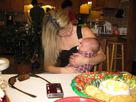 Austin was greeted by a curious Madilyn who proceeded to say hello not so gently! :) She was very interested in him and always wanted to see the baby. We ate as soon as we got there and of course Austin woke from his nap the moment I picked up my fork to start eating. Luckily I have pretty much mastered the one handed eating thing. Of course it wasn't long before he was in the hands of everyone around and being passed from one person to the next!