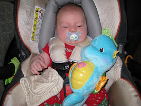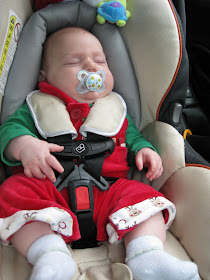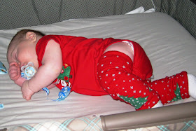 By the time we started to open presents, Austin had fallen asleep and we put him down in Madilyn's crib for a little nap. He woke up about an hour later happy and content. He helped us open a few more presents and got lots of very cute things. We packed it up and headed home a little later and Austin zonked out in his crib for a 7 hour stretch!!! We knew he was exhausted from a long and exciting day but never thought we'd wake up before he did on Christmas morning! I'm quite sure this will change the older he gets! :)
