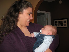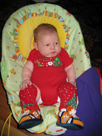 Yesterday he started sneezing a lot and had some diarrhea and last night after his 4am feeding, he vomited and it scared me to death! Being the panicky new mom that I am, I called the doctor's office as soon as they opened and talked to a nurse about my sick little guy. She said it sounds like he's just got a cold and the mucus buildup is causing the vomiting and diarrhea. She said to use a humidifier and saline drops, which I've already done, and that there's really nothing else we can do but wait it out.