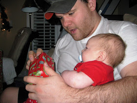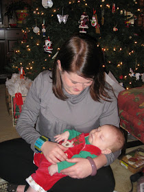 Late afternoon we packed up once again and headed back home to Greenville for Christmas dinner with Grandma Jo Ann. She arrived at our house with a fabulous dinner around 6:30 and for the third time Austin woke up right in the middle of dinner ready to get out of his carrier and eat too! After eating, Grandma Jo Ann fed him while Ryan and I cleaned up the kitchen and then we settled down in the den and got ready to open gifts. Unfortunately, Austin was in quite the mood and had a hard time settling down. I know he had a busy two days and I think all the excitement finally got to him. We stopped mid-present opening and I put him in the bath because he really loves his bath and it usually calms him down pretty well. After the bath he finally fell asleep in his swing but woke up several minutes later and still wasn't happy. He did calm down eventually though and we put him in his crib for the night. Christmas was over for our little guy around 10pm, but we stayed up and finished exchanging presents with Grandma Jo Ann until after 11.