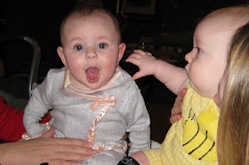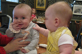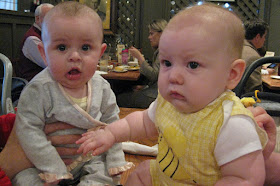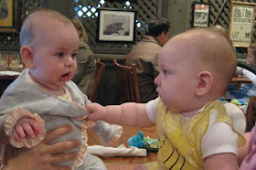 Austin and his "girlfriend" Sofia met up for lunch and some Babies R' Us shopping today. Everyone wanted to know if they were twins since they are so close to the same size (Sofia is only 1 week younger). Austin was very intersted in Sofia , typical boy, right? :)