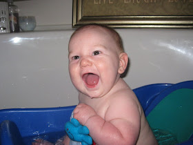 In addition, Austin has become quite the wiggle worm! He is no longer my cuddly little boy, in fact, if I want to cuddle him now he pretty much has to be asleep or have a bottle in his mouth! He is SO interested in everything around him and wants to touch and feel and put everything he sees in his mouth. He loves to grab hair, jewelry, noses, lips, clothing, dog hair, cat fur, his spoon, his toys, the phone, the remote, and pretty much anything else within reach, but most recently, his favorite things to grab are his own feet! Every time I go to get him out of his crib he is on his back with his feet in the air and trying to grab them and put them in his mouth. He's quite flexible for a pudgy little fellow and while sitting up can lean all the way forward to his feet and put his toes in his mouth.