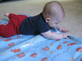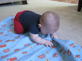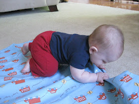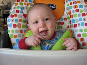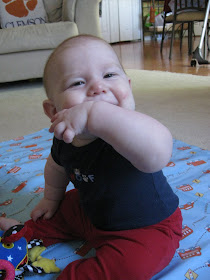 Austin has been sitting well for over a month, but now he can sit for much longer periods of time as well as turn and pick up his toys and look all around without losing his balance. If he does lose his balance, however, he can usually push himself back into the sitting position without toppling over. He will also raise up onto all fours when on his belly like he's trying to crawl. I've put toys in front of him to see him try to move towards them, but he always ends up kicking his legs out and scooting backwards for some reason instead of forwards! He loves his toys and his hand-eye coordination has really improved. He will grab anything in his reach and either put it directly into his mouth or bang it against the floor, table or whatever else is around. He really enjoys making noise either by banging or shaking his toys or with his own mouth. He has recently learned to "blow raspberries" and thinks it's hilarious when you do it back to him. Several times he has done it with food in his mouth, causing it to splatter everywhere! He is also saying "ma-ma," but usually only when he's getting tired or frustrated. He may not know that I am "ma-ma," but he sure knows that saying it gets my attention! Ryan caught a cute video of him saying it the other weekend that I'll have to post soon.