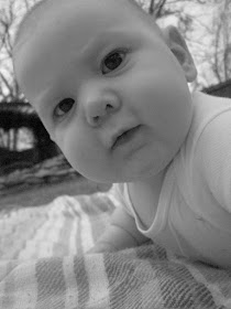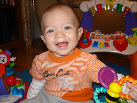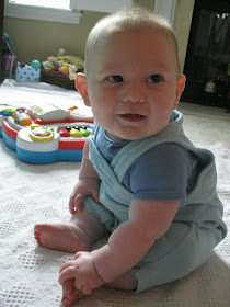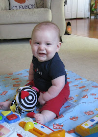 Austin went in today for his 6 month check-up. He weighs 20 lbs. 1 oz. which is in the 88th percentile and he's 27 inches long which is the 71st percentile. His head circumference measured in the 71st percentile as well. The doctor was very impressed by Austin's physical stature and said that he was pretty advanced for a 6 month old. (I knew I had a little smarty-pants!) He couldn't believe Austin was already sitting on his own so well, pushing up on all fours and putting syllables together and saying things like "ma-ma." He said we'd have a little crawler on our hands in no time!