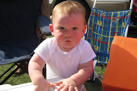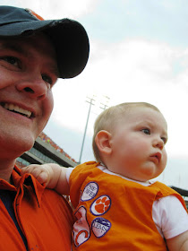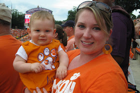 It started raining at the end of halftime and we decided to tough it out. A little drizzle doesn't scare you away from watching the Clemson Tigers play! Austin didn't seem to mind the wetness but we wrapped him up in a blanket anyway to keep his warm and somewhat dry. About midway through the 3rd quarter I looked down and he was sound asleep in my arms. It was sooo cute and amazing that not even the 3 drunk guys yelling behind us could even wake him from his deep slumber!