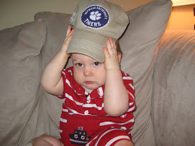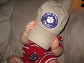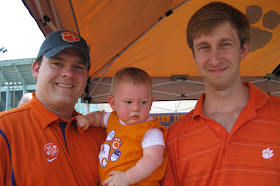 Finally, the day we've all been waiting for, Clemson's 1st home game was this Saturday! We've had season tickets for the past several years and were so excited to take Austin to his first Clemson football game. We got to the tailgating spot that afternoon and cooked up some low country boil and hung out with friends while awaiting the game. Austin enjoyed playing with his buddy Tyler and Aaron's dog, Baxter. The sun was out in full force and my little man was quick to get red in the face. I had to strip off his adorable homemade jumper and let him roam around in nothing but a plain white onesie to cool down!