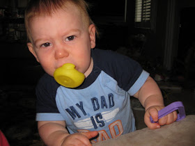 Backing up a little bit, as I've mentioned before, Austin loves his paci. He loves it so much that we limit his paci access to bedtime and in special situations (such as public place meltdown moments). We are not being mean to our paci-lovin' baby, but rather making the eventual weaning process easier on us all. Limiting his paci access, however, doesn't stop my dear boy from putting anything and everything in his mouth to try and find a replacement.