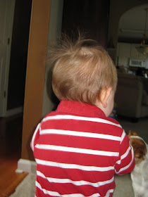 In other news, Austin's hair is starting to get so long now and those 2.5-3 hour naps give him some serious bed head. Take a look at that head of hair after today's nap...and what we did to try and fix it!