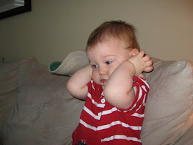 Peek-a-boo is Austin's favorite game and he will literally play it for as long as we will continue to say "peek-a-boo" everytime he jumps up from behind the coffee table. Sometimes he tricks us by staying hidden for and extra long time and will then sloowwly emerge to make sure we're still there watching. He also loves for mommy to hide and jump out as well.