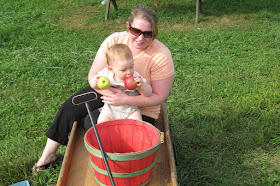 We set out with our 1/2 bushel basket in hand and went frolicking through the rows and rows of apple trees ready to pick some big, ripe juicy Galas, McIntosh, Cortlands and Golden Delicious. Much to our dismay, the trees had been pretty picked over from the previous Labor Day weekend bash and we ended up with about 8 Golden Delicious and 3 McIntosh. Austin was a big help reaching the high ones but needed a rest after all that picking and asked us to pull him around in the wagon for awhile.