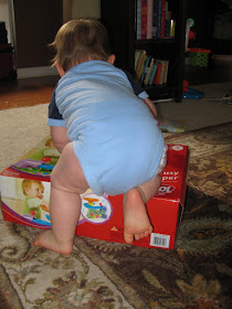 Woo hoo! He finally grabs the pink one and then the yellow one and puts them back down the chute so they can pop out again. Meanwhile, I'm grinning from ear to ear and so proud of myself for getting the greatest toy ever that he's sure to enjoy for a long, long time....WRONG! I turn my head for a minute and he's off to the diaper stack to pull them all out and spread them on the floor...then to the bottles of lotion and diaper rash cream....and then, the actual greatest toy ever....the box that his new Busy Ball Popper came in!