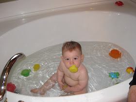 Austin's favorite time of day is when daddy gets home in the evenings and bath time. He gets SO excited when he hears the front door open and takes off straight to see his dada (who loves coming home everyday to such a nice welcome). He also loves to take his nightly bath and splash and play in the tub. He's learned to turn the water on and off and thinks it's really fun. I have to restrict access to the Hot so he doesn't burn himself though.