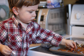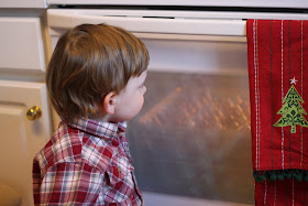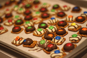 This holiday snack is great for making with kids. Austin not only loved the taste testing, but he was a good helper too! He was great at laying out the pretzels and loved pushing the M&M's into the gooey chocolate. We made up a little song and sang it while we baked. Lucy was at our feet the entire time waiting for anything that fell on the floor, which was a lot considering my baking partner.