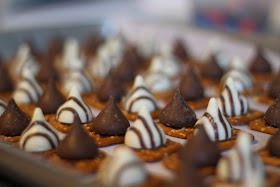 - Heat the oven to 170F. Set a number of bite-size, waffle-shaped pretzels (one for each treat) in a single layer on a cookie sheet lined with parchment paper, then top each pretzel with an unwrapped Hershey's Kiss or Hershey's Hug.