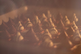 - Bake for 4 to 6 minutes (the white chocolate will melt more quickly), until the chocolates feel soft when touched with a wooden spoon. Remove the cookie sheet from the oven and quickly press an M&M's candy into the center of each Kiss.
