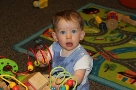 Austin started swim lessons last week. Naturally, my little water baby was a huge fan! He worked on floating on his back, kicking his legs, doggy paddling, jumping in the pool and going under the water, touching the bottom, holding his breath and putting his face in the water. His teacher was impressed with his willingness to do what she asked and his fearlessness. Owen was sad he couldn't join big brother in the pool, but lucky for him there was a great little playroom to hang out in during brother's lesson.