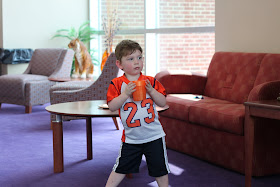 -Owen's most favorite thing to do is to race! Him and Austin go and stand in one corner of the room and I say "Ready, Set, Go!" and they both take off in my direction. Even though Austin is faster, Owen can be quite tricky and will start running to me before Austin makes it back and gets ready.
