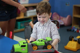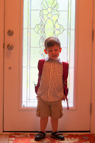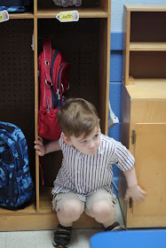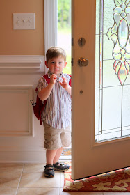 Austin couldn't wait to go back to school this morning and I had virtually no trouble getting him ready to go as long as I phrased every request with, "If you ________, we can go to school today!" He was so excited I could barely get a picture of him before he went running out the door. At school, he immediately walked into his classroom, found his name on his cubby and then found the exact same truck he played with at open house last week. I lingered for a few minutes just watching him and he paid me absolutely no attention whatsoever. I told him bye and got no response back but when I told him to tell Owen bye-bye, we got a partial look and a quiet "...bye, Owen." I just hope he's always this happy and excited to be at school!!