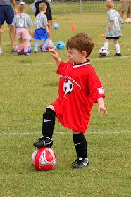 Austin loved the warm up and Ryan and I got a kick out of watching him try to do jumping jacks. Then the kids kicked the ball in the goal a few times and Austin enjoyed that as well. The dribbling drills were a little tricky as he didn't get the whole idea about not touching the ball with your hands. Coach M had learned Austin's name by this point and was using it a lot. The funniest thing was when the coach told the kids to dribble their balls over to the white line. Austin took this as meaning his ball had to be directly on the white line and was not satisfied until his ball was resting exactly in place. He kept fidgeting with the ball until it was lying directly on the line and he was so concerned about the placement of his ball that he would miss the rest of the instructions. He sooo gets that from his daddy!